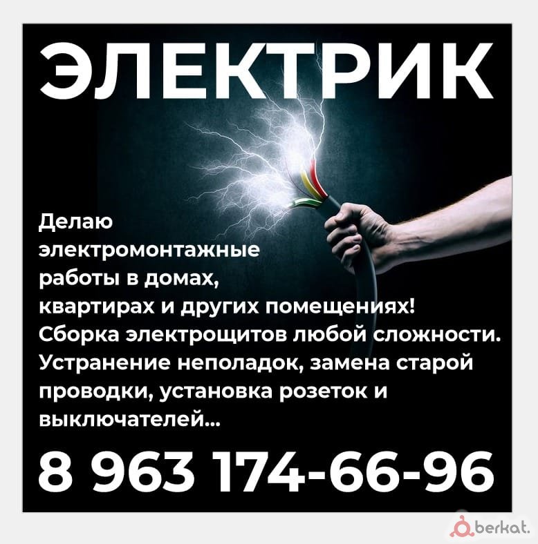 Делаю электромонтажные работы в домах, квартирах и других помещениях!Сборка электрощитов любой сложности. Устранение неполадок, замена старой проводки, установка розеток и выключателей..