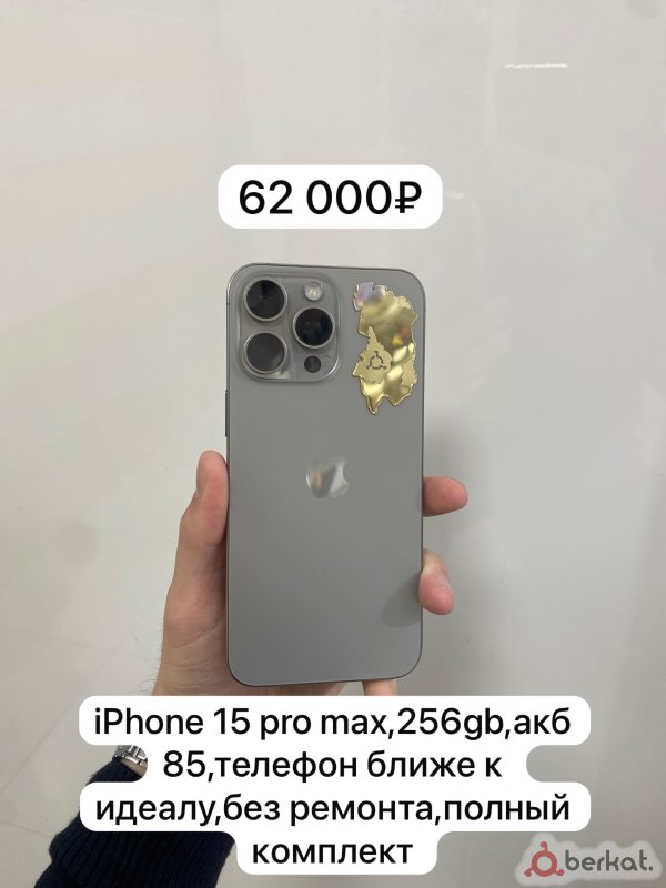 Продаю iPhone 15 Pro Max 256 ГБ. Телефон в хорошем состоянии, использовался аккуратно. Аккумулятор — 85%, работает стабильно, заряжается без проблем. Экран без трещин, Face ID полностью исправен, камера и динамики работают идеально. • • Состояние корпуса: «идеальное», • Ремонт: не ремонтировался / • Комплектация: /кабель/чехлы • Apple ID отвяжу при продаже Цена: 65000